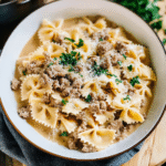 Creamy parmesan garlic beef bowtie pasta is a delightful fusion of tender ground beef, al dente bowtie pasta, and a rich, creamy sauce infused with aromatic garlic and parmesan. Perfect for weeknight dinners or special occasions, this dish transforms everyday ingredients into a comforting meal that will have everyone asking for seconds. Gather your loved ones around the table and savor the indulgent flavors of this easy-to-make recipe.