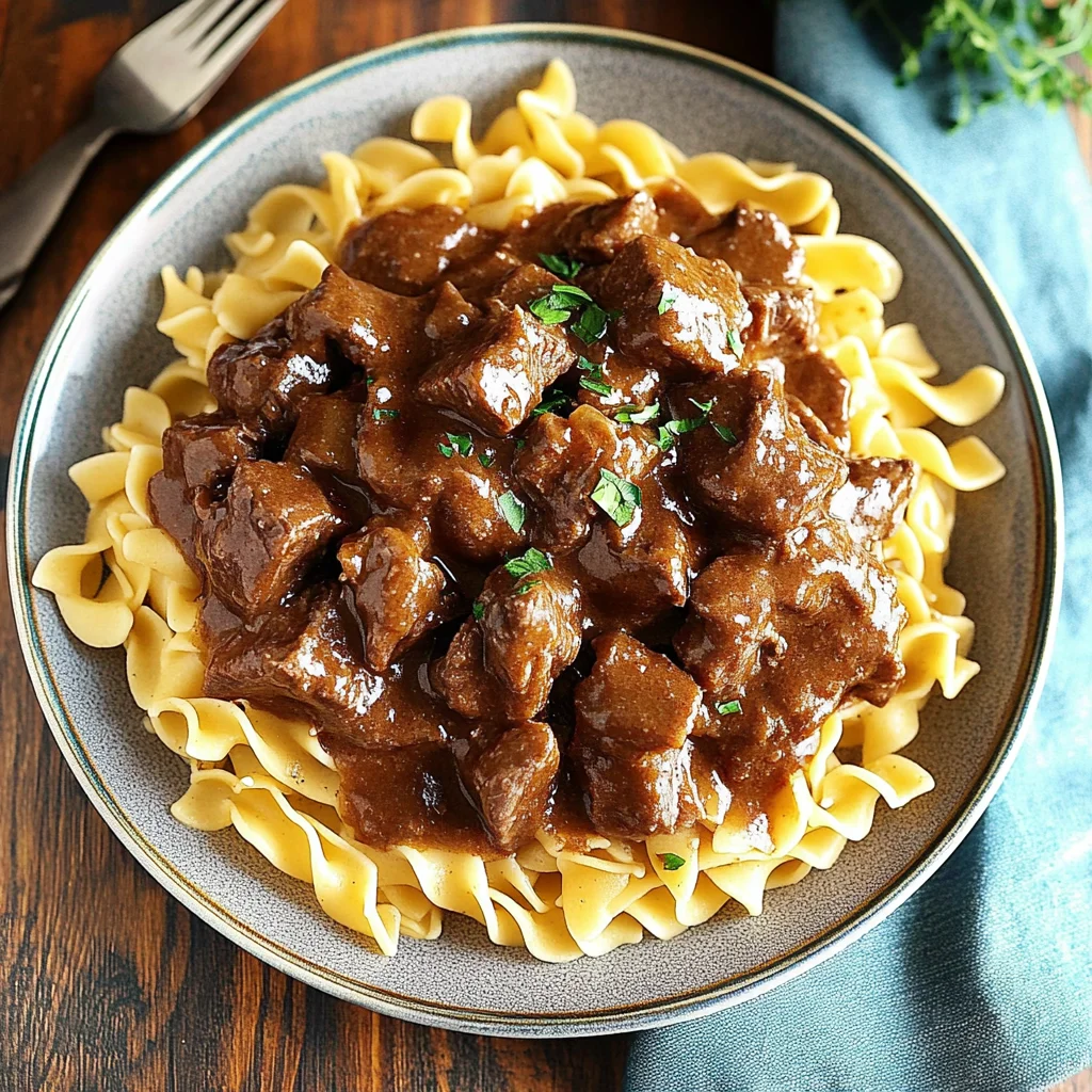 A hearty and comforting dish featuring tender beef, rich gravy, and egg noodles, all cooked slowly in a crockpot for maximum flavor.