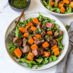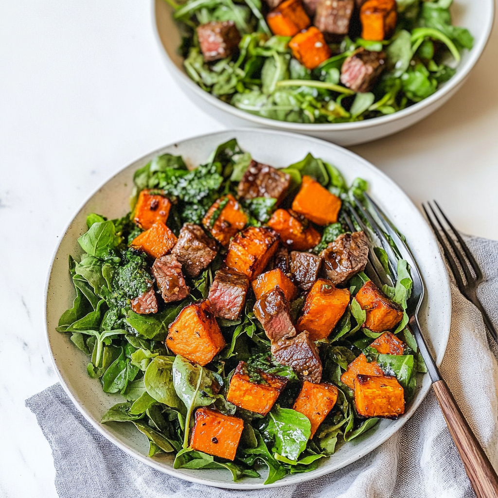 - Assemble salads by layering greens, roasted sweet potatoes, and sliced steak on plates.