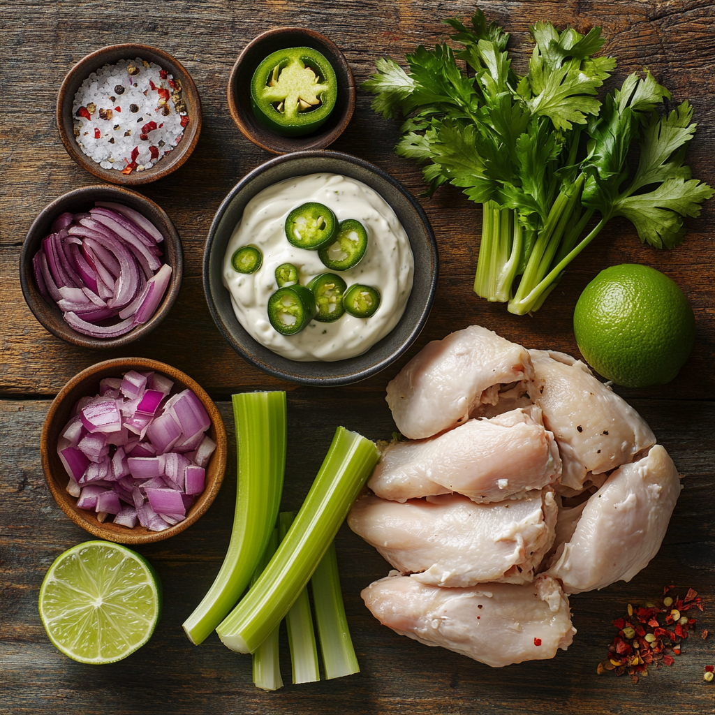 While the chicken is cooking, grab your fresh jalapenos, red onion, celery stalks, and chop them into bite-sized pieces. Make sure you keep an eye on those jalapenos; they can be sneaky little devils when it comes to heat!