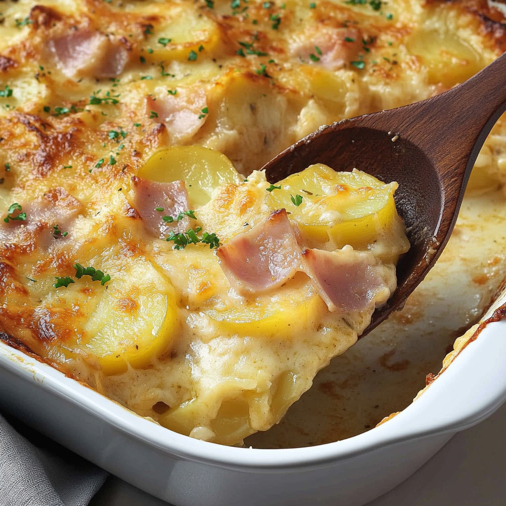 In summary, Potatoes Au Gratin with Ham is an exquisite comfort food that impresses both family and guests alike. With its harmonious blend of flavors from creamy cheese sauce and savory ham layered between tender potatoes, it’s an easy yet indulgent dish to prepare. Whether you’re making it for special occasions or weeknight dinners, this recipe is versatile and enjoyable for everyone at the table. Don’t hesitate to try out different variations to make your version of Potatoes Au Gratin with Ham truly unique!