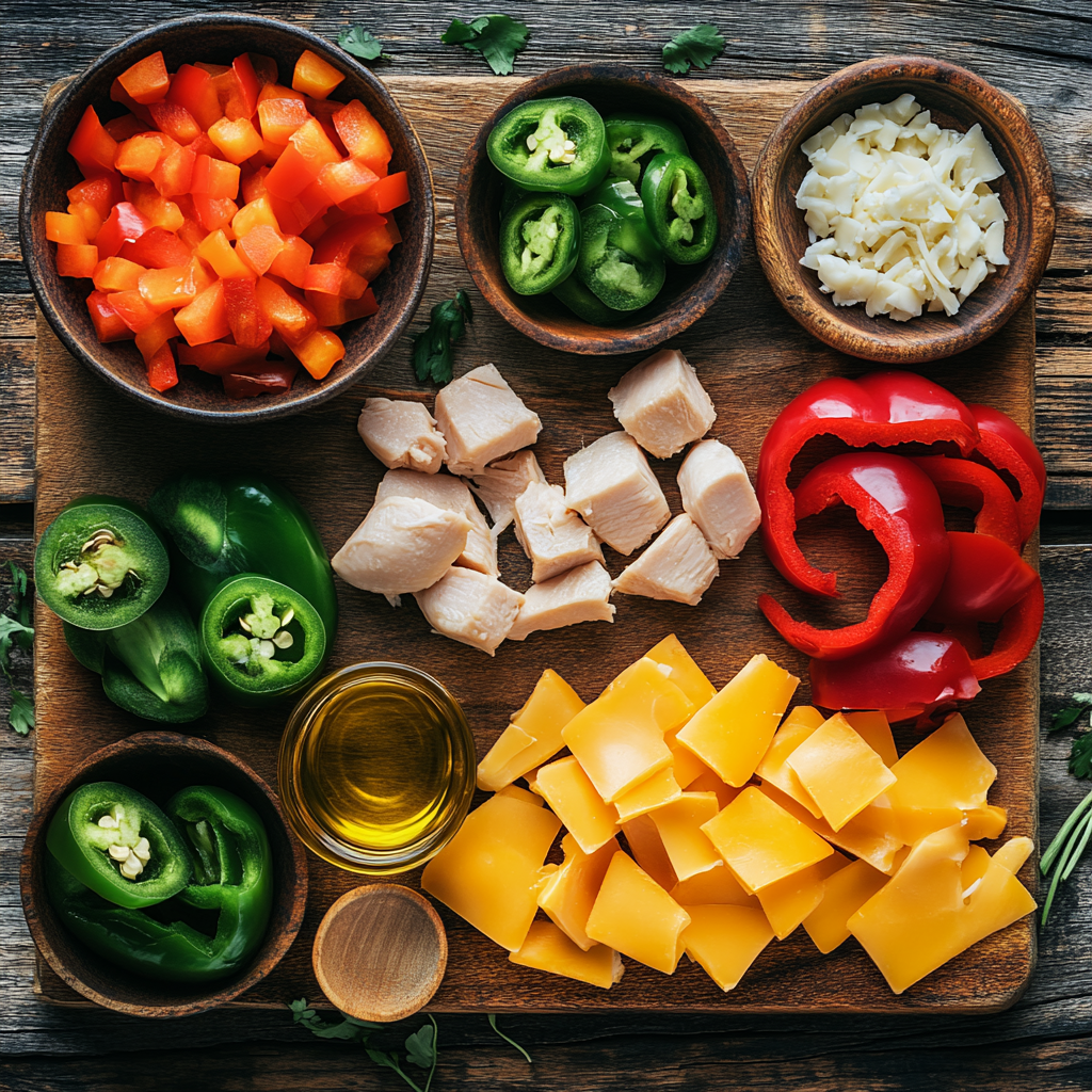 Begin by dicing your chicken breasts into bite-sized pieces. Mince the garlic, chop the bell peppers, and slice those jalapeños like you mean it!