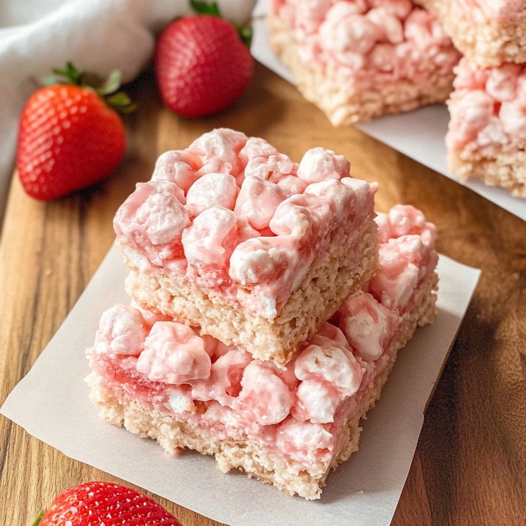 In conclusion, Strawberry Rice Krispie Treats offer a fun and fruity twist on a beloved classic snack. They’re simple to prepare and customizable, making them perfect for parties or family gatherings. Remember to store them properly to enjoy their delightful flavor for several days. Whether you’re making them for yourself or sharing with friends, these treats are sure to be a hit! Try out this recipe today and indulge in the sweetness of Strawberry Rice Krispie Treats!